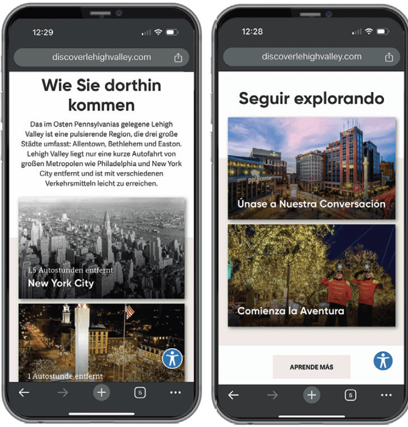 In spring of 2024, DLV launched custom content for foreign English, Spanish, and German speakers visiting DiscoverLehighValley.com. Content includes travel information from airports, UNESCO World Heritage, attractions, and more.
