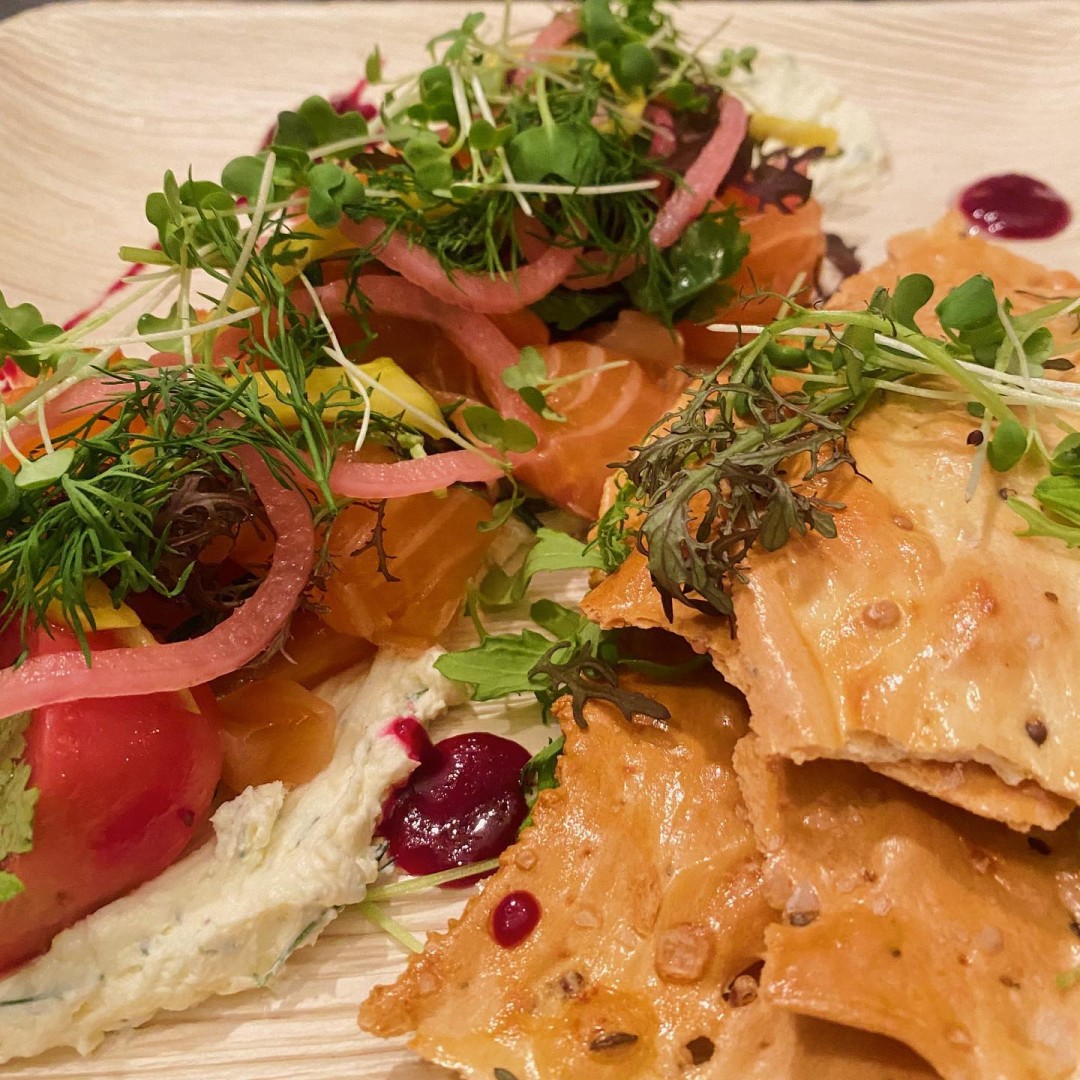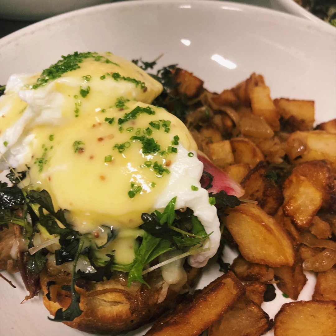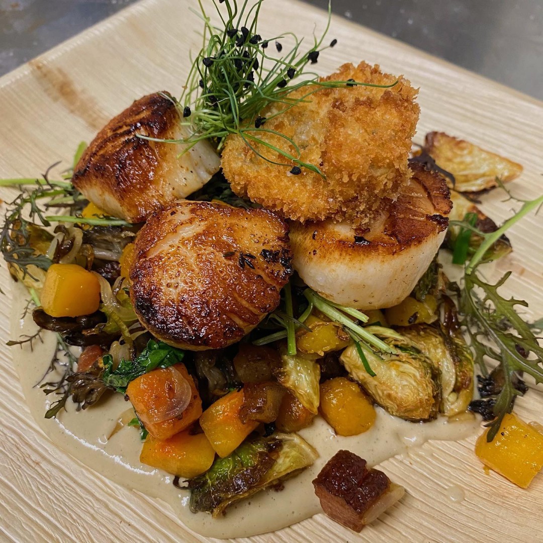 - Roasted local baby beet salad (herbed goat cheese croquette, frisee, toasted hazelnuts, beet vinaigrette, and pickled beech mushrooms)