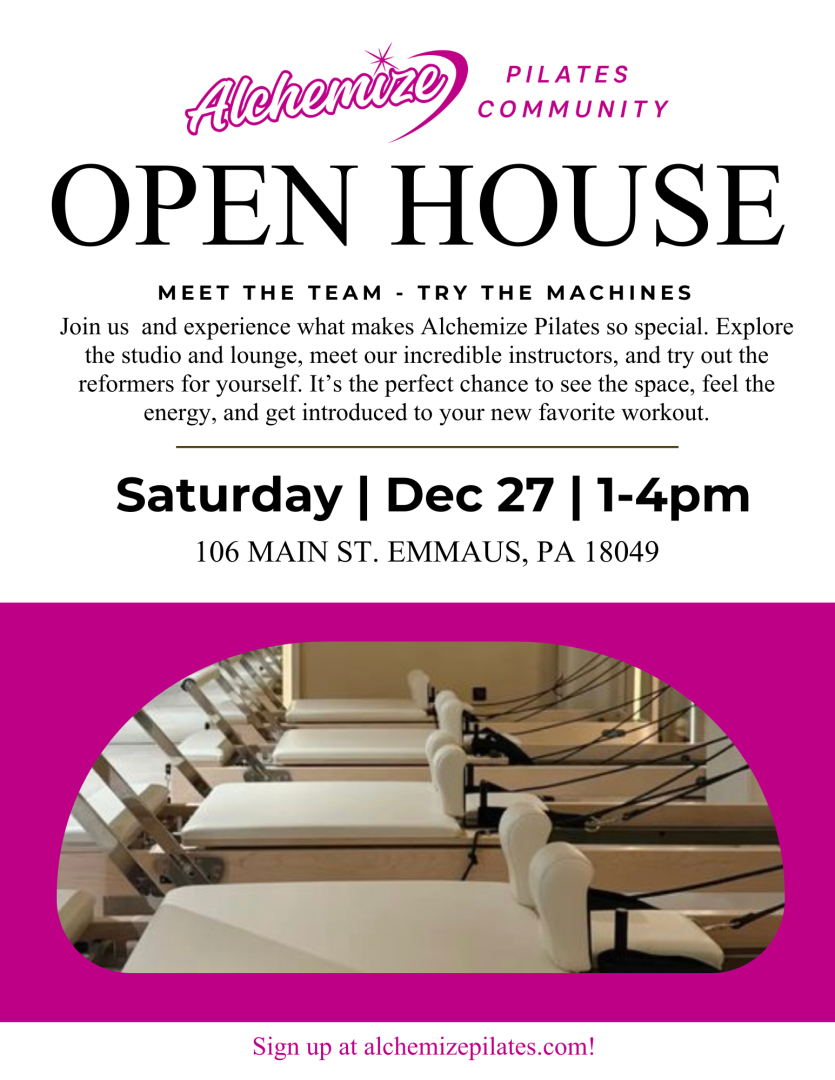 Join us for our Open House to explore the studio, meet the team, and experience what makes Alchemize special. Guests are invited to tour the space, try the reformers, enjoy light refreshments, and learn more about membership options and upcoming community events.