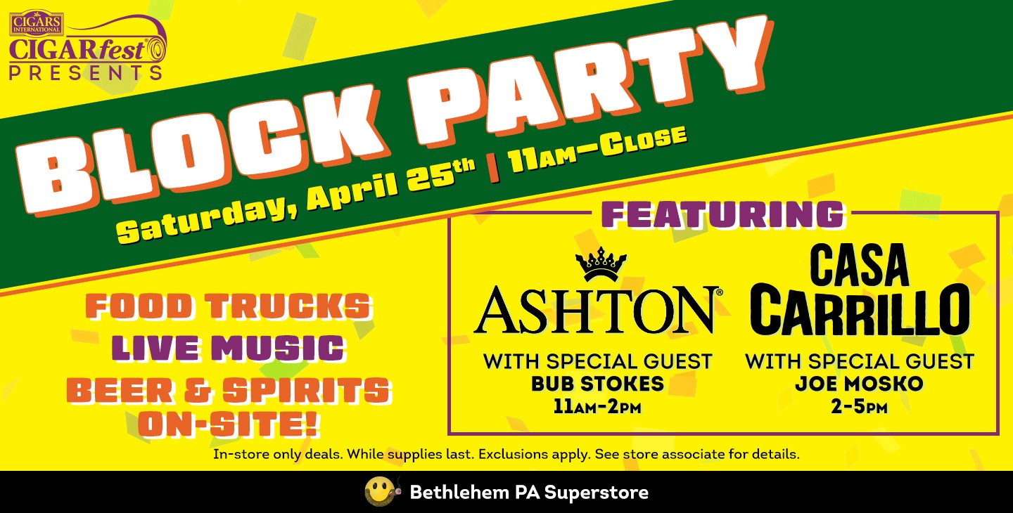 Join us at the Cigars International Bethlehem Superstore for our Block Party on Saturday, April 25th from 11am to close! Enjoy a full day packed with food trucks, live music, and on‑site beer and spirits. This special event features appearances by premium brands Ashton with guest Bub Stokes from 11am–2pm, and Casa Carrillo with guest Joe Mosko from 2pm–5pm. Don’t miss exclusive in‑store deals available only during the event. Visit the Cigars International Bethlehem Superstore for one of the best cigar events of the season.
