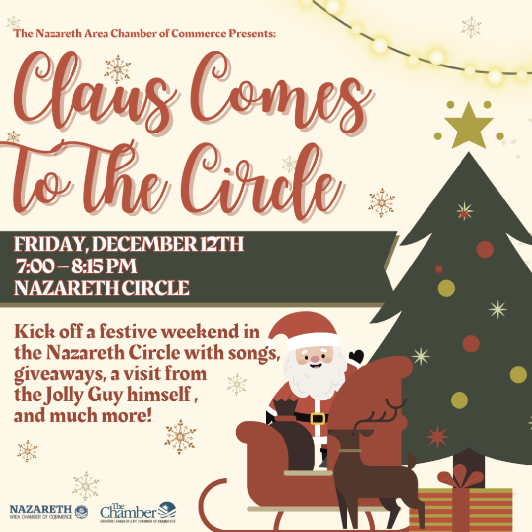 Join the Nazareth Area Chamber of Commerce on December 12th from 7:00 to 8:15 PM for a holiday program at the Nazareth Circle! Enjoy sing-alongs, festive activities, giveaways, and a surprise visit from Santa Claus himself from the North Pole. Kick off the holiday season with friends, family, and the entire Nazareth community for an evening full of cheer and celebration.