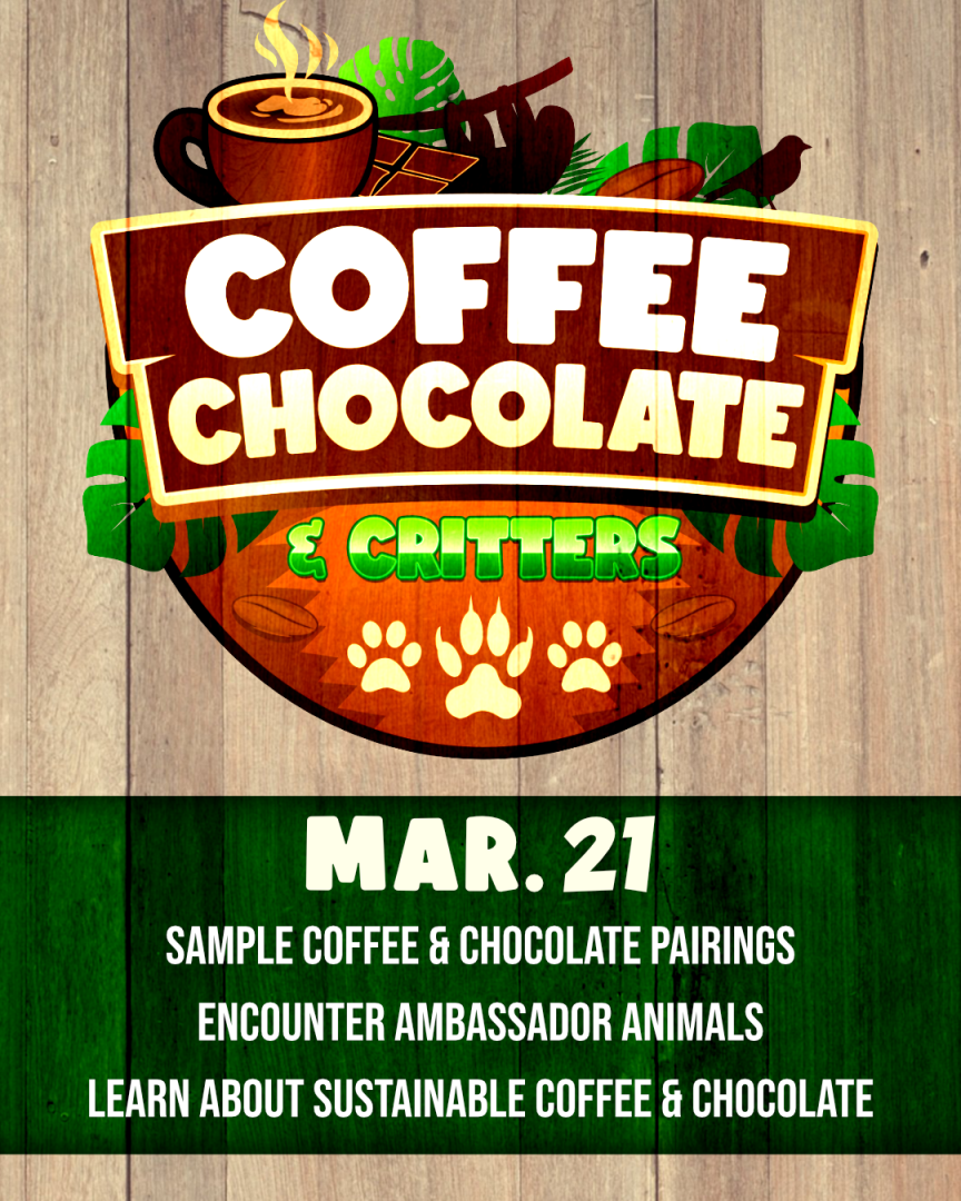 Join us for an event that brings together everyone’s favorite things… Coffee, Chocolate, and Critters! This morning program brings conservation to the Lehigh Valley, promoting sustainable items like Bird Friendly Coffee and Bird Friendly Chocolate. Guests can enjoy chocolate and coffee samples while they meet some of the animals that they are helping to save!