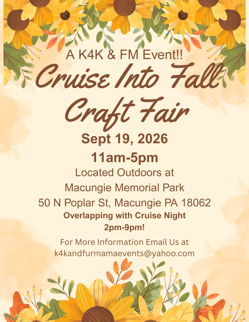 We at K4K & FM Events are excited to invite you to our annual 2026 Cruise Into Fall Craft Fair!!! This is an outdoor event. We anticipate 80+ vendors!!! Please mark your calendars to come on out and support local crafters/vendors!! This event overlaps with the park's cruise night!!