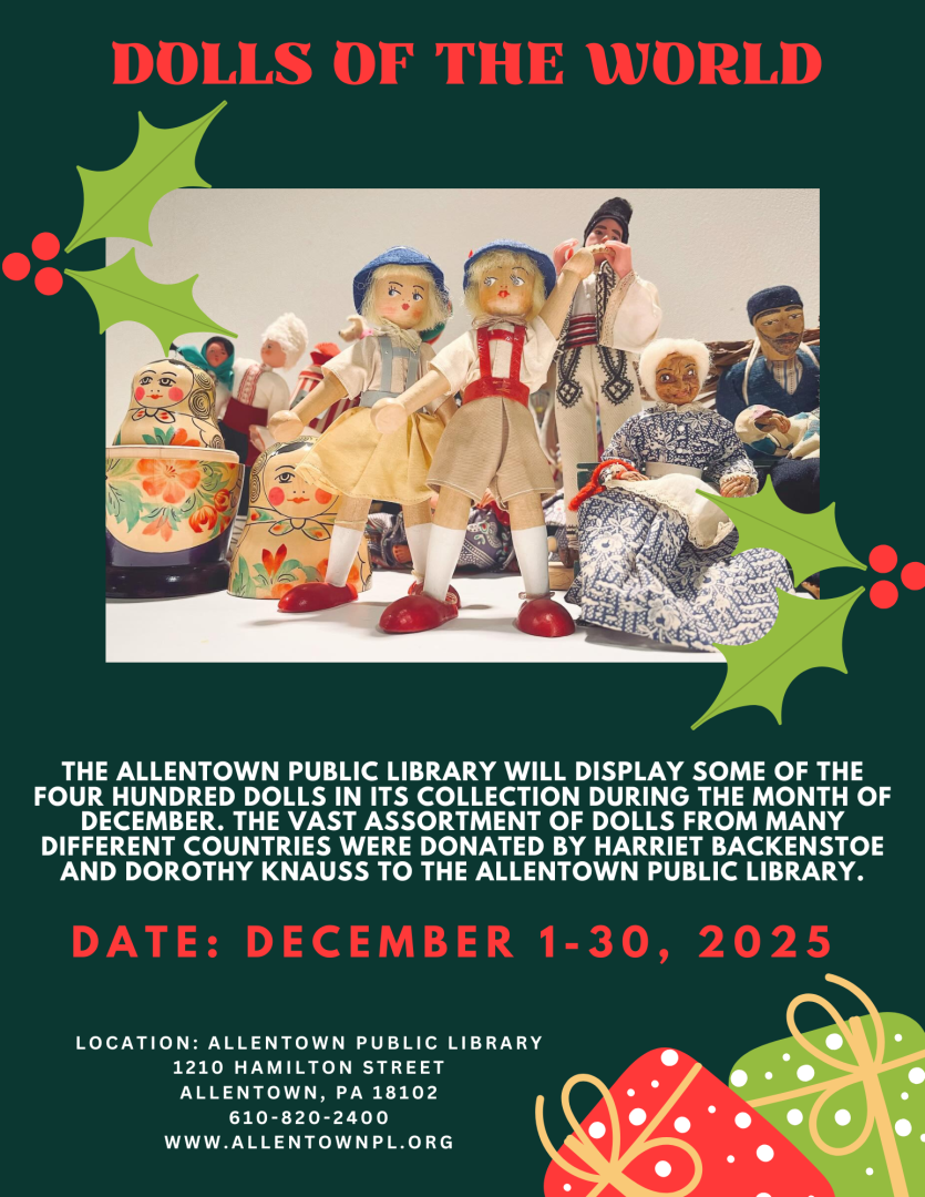 The Allentown Public Library will display some of the four hundred dolls in its collection during the month of December. The vast assortment of dolls from many different countries were donated by Harriet Backenstoe and Dorothy Knauss to the Allentown Public Library.