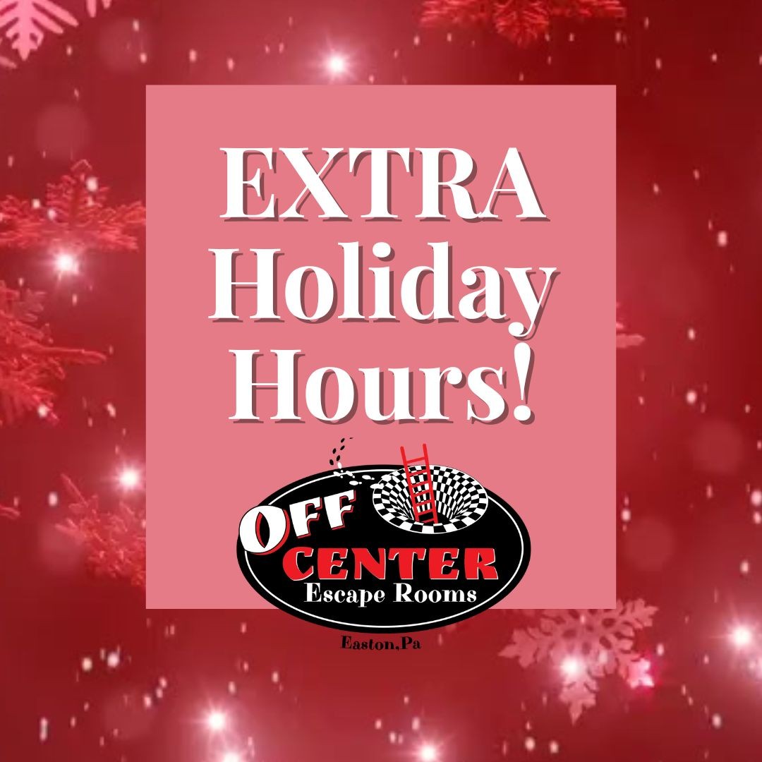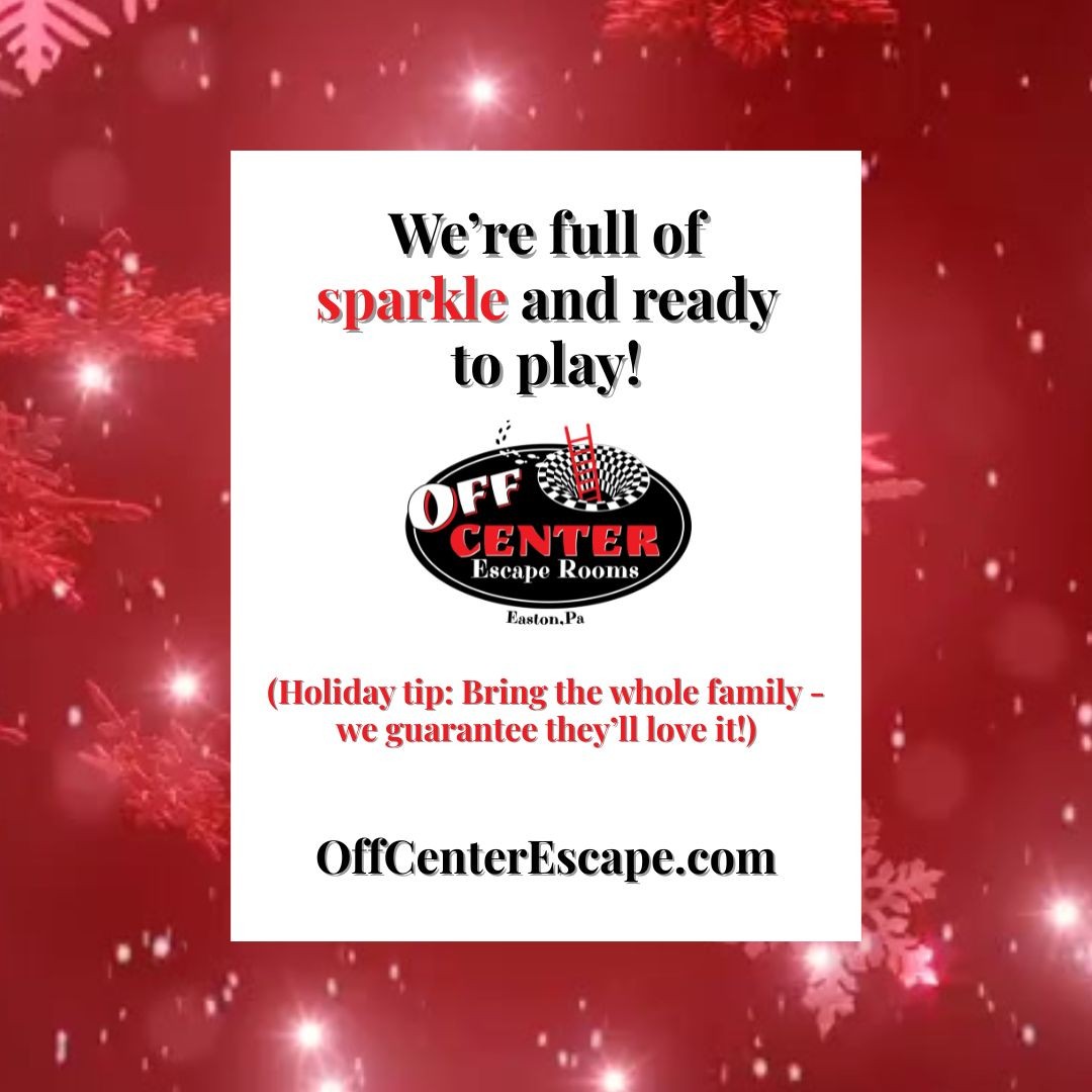 Family in town? Come play! Kids bored? Come play! We are opening extra days to give you even MORE chances to play! In addition to our regular Fri/Sat/Sun times, we will be open on Tuesday, December 23rd, Monday December 29th and Tuesday December 30th. Check out our website for bookings times and more information: www.OffCenterEscape.com