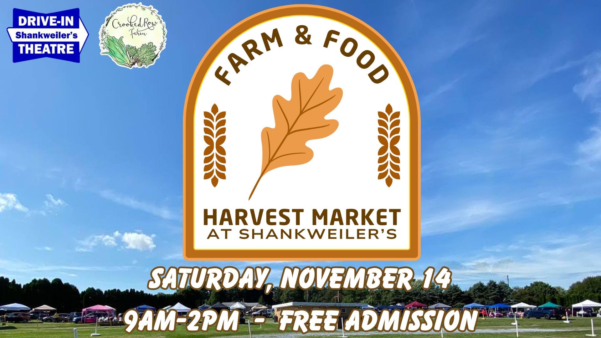 The Farm & Food Harvest Market is a daytime vendor event held outdoors at Shankweiler's Drive-In Theatre in Orefield, PA, on November 14, 2026 from 9AM-2PM.