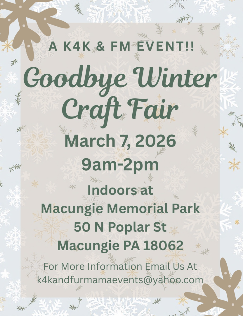 We at K4K & FM Events are excited to invite you to our annual 2026 Goodbye Winter Craft Fair!!! This is an indoor, 2 floor event. We anticipate 80+ vendors!!! Please mark your calendars to come on out and support local crafters/vendors!!
