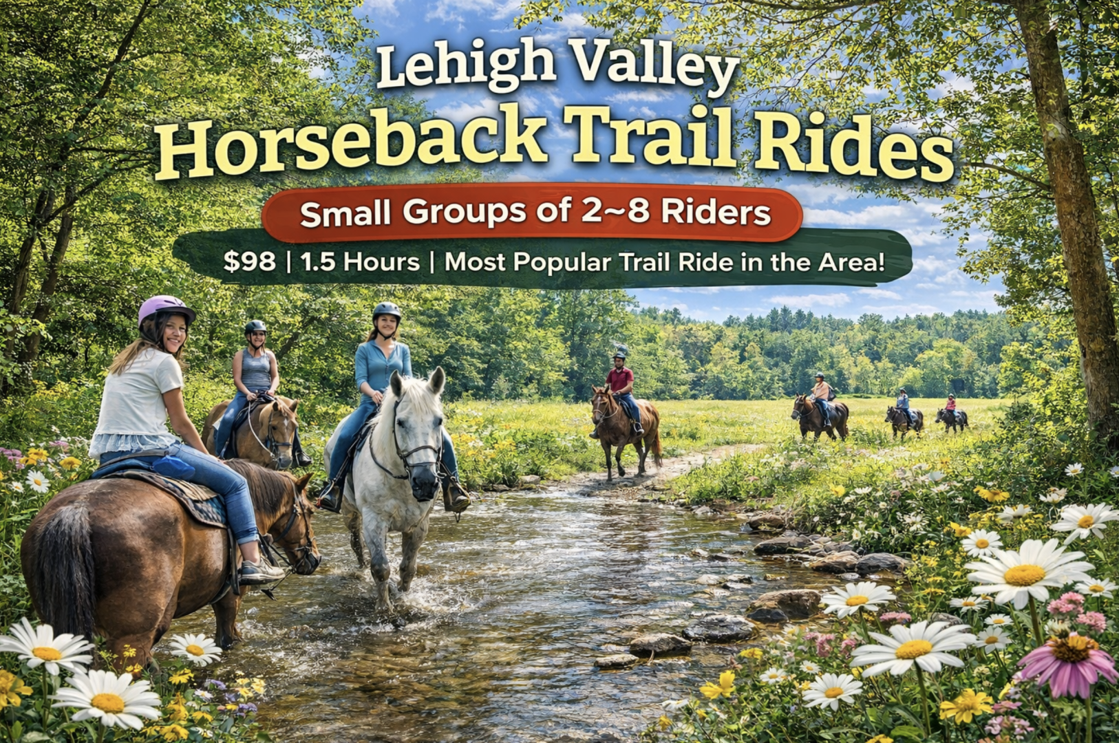Saddle up for a stunning 1.5-hour Spring, Summer, and Fall Trail Ride through creeks, colorful foliage, and some of nature’s best sights with Lehigh Valley Trail Rides!