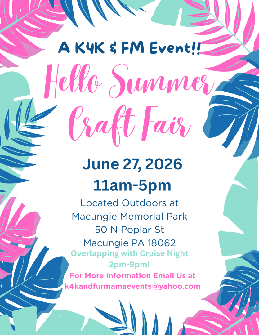 We at K4K & FM Mama Events are excited to invite you to our annual 2026 Hello Summer Craft Fair!!! This is an outdoor event. We anticipate 80+ vendors!!! Please mark your calendars to come on out and support local crafters/vendors!! This event overlaps with the park's cruise night!!