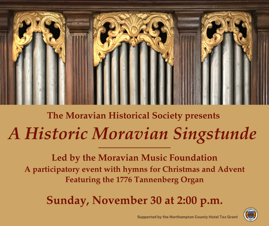 Experience a 300-year-old musical tradition in the intimate Saal of the Moravian Historical Society’s museum. We invite you to join us for a traditional Moravian Singstunde, or singing hour, beautifully accompanied by the historic 1776 Tannenberg Organ. This special program celebrates the Advent and Christmas season through music and reflection, with hymns sung in both English and German.