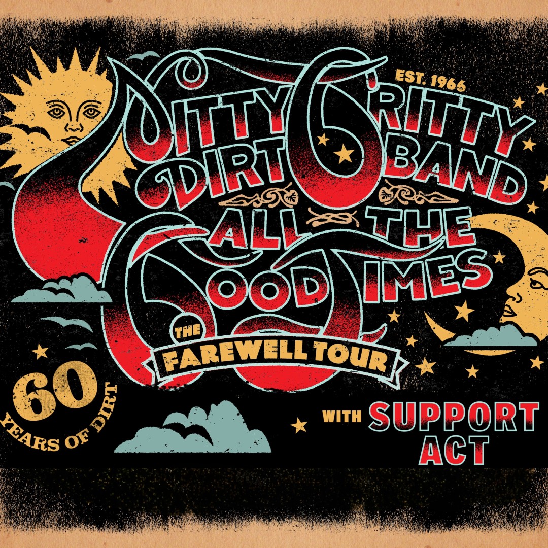 On March 21, 2024, Nitty Gritty Dirt Band kicked off the first of its last traditionally scheduled gigs, ALL THE GOOD TIMES: The Farewell Tour, which has received critical acclaim. This isn’t goodbye forever, but it will be the last fans see of multi-city runs and long bus rides. As 2026 approaches, so does the band’s remarkable 60th Anniversary, and to celebrate, NGDB’s ALL THE GOOD TIMES: The Farewell Tour — 60 Years of Dirt will showcase a special slate of performances and appearances. These exceptional shows celebrate the music created by the legendary, yet ever-evolving NGDB.