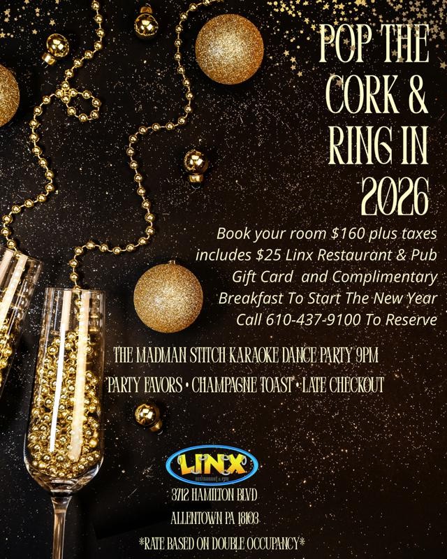 Celebrate New Year’s Eve in style with the Pop the Cork & Ring in 2026 overnight package! Book your room for $160 plus taxes (rate based on double occupancy) and enjoy a festive night out. The package includes a $25 Linx Restaurant & Pub gift card and complimentary breakfast to start the New Year right. Ring in 2026 at 9 PM with The Madman Stitch Karaoke Dance Party, complete with party favors and a champagne toast to cap off the night.