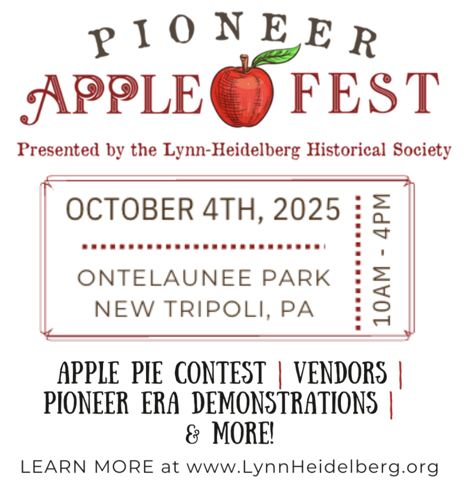 The Lynn-Heidelberg Historical Society's Pioneer Apple Fest is a free immersive event celebrating colonial and pioneer heritage. Come enjoy colonial demonstrations, local makers and artisans, apple cider, apple dumplings, warm stew cooked over an open hearth fire, and so much more! While this is a free event, donations are encouraged upon arrival.