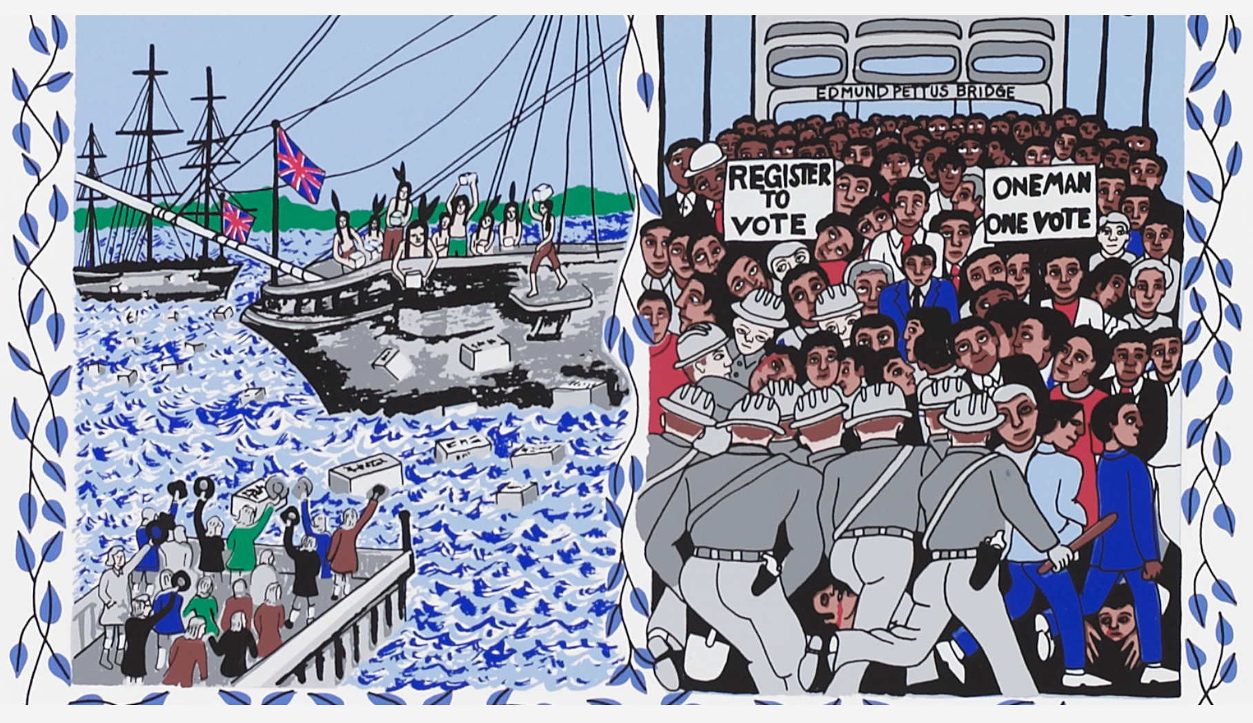 Revolution Retold features a wide range of material—from flasks and furnishing fabrics to contemporary prints. Such works often depict iconic Revolutionary figures or events, with the goal of recalling American history and values. In this exhibition, they also reveal an enduring fascination with the story of our nation, and how we look to the past to make sense of the present.