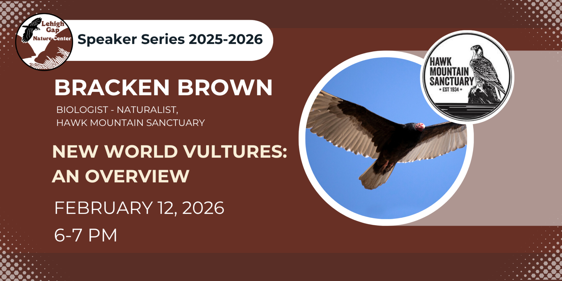 Join us in person at Lehigh Gap Nature Center for a Speaker Series presentation from Bracken Brown, a biologist and naturalist from Hawk Mountain Sanctuary. Learn about new world vultures and how Hawk Mountain works to de-stigmatize these important animals, trap and track them to uncover important data and detect potential threats, and conserve their populations for years to come.