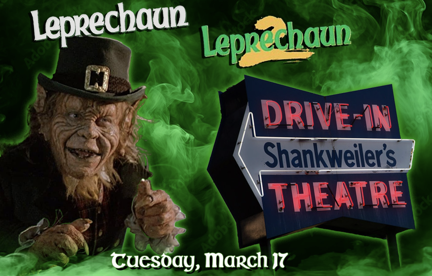 It’s your lucky day! We’re excited to announce the return of our Saint Patrick’s Day celebration at Shankweiler’s Drive-In, featuring our annual double feature of LEPRECHAUN 1 & 2! Come experience these two solid‑gold cult classics that launched a wonderfully wild anthology of home‑video oddities.