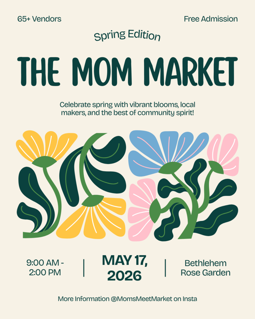 Now celebrating its fourth season, The Mom Market returns to the beautiful Bethlehem Rose Garden for a vibrant spring gathering. Explore an incredible lineup of women and mom‑owned businesses offering everything from art and handmade goods to wellness, food, clothing and family fun.
