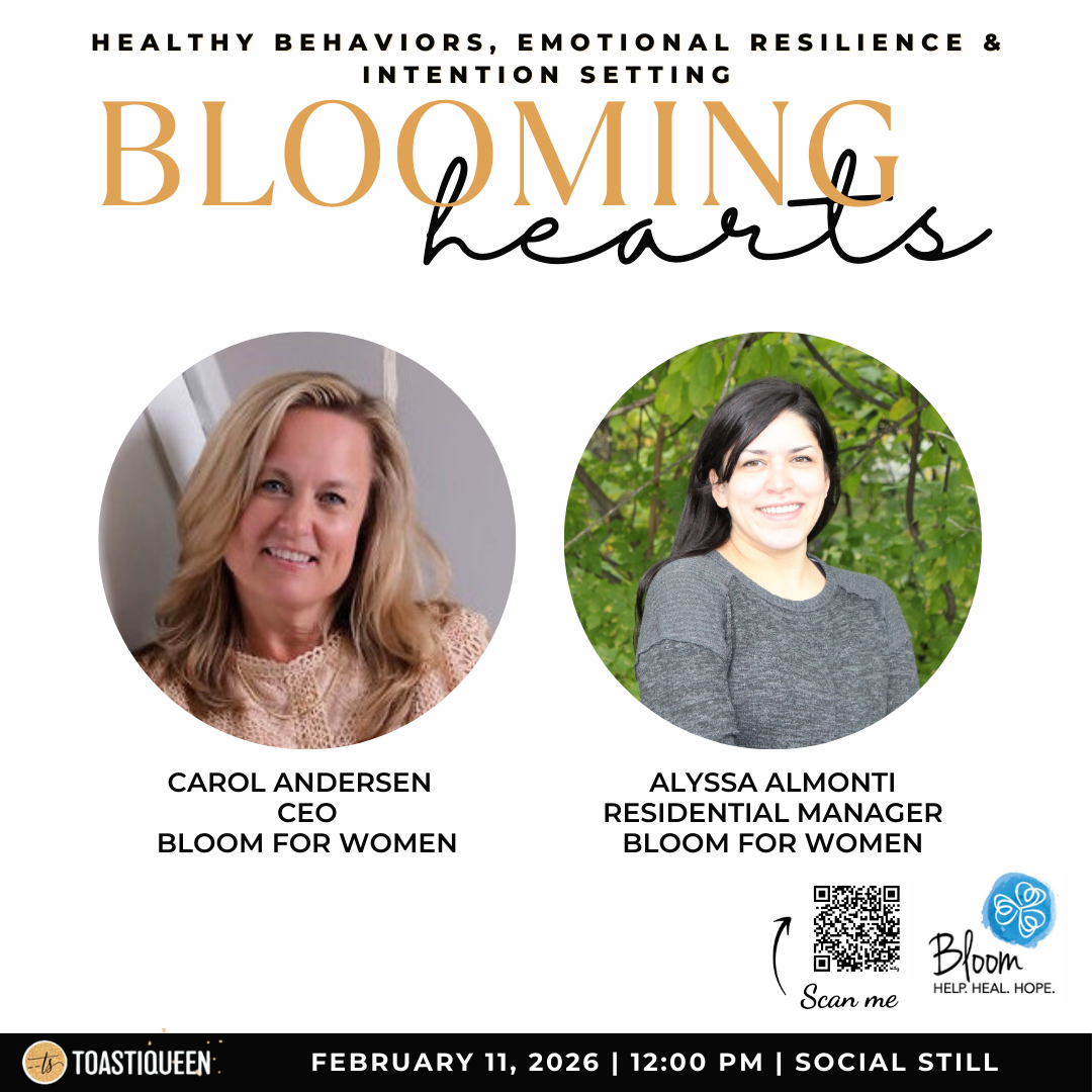 Blooming Hearts is a ToastiQueen professional development experience focused on healthy behaviors, emotional resilience, and intension setting for a new year. In partnership with Bloom for Women, this meaningful February gathering blends conversation, creativity, and compassion. This is a one day event.